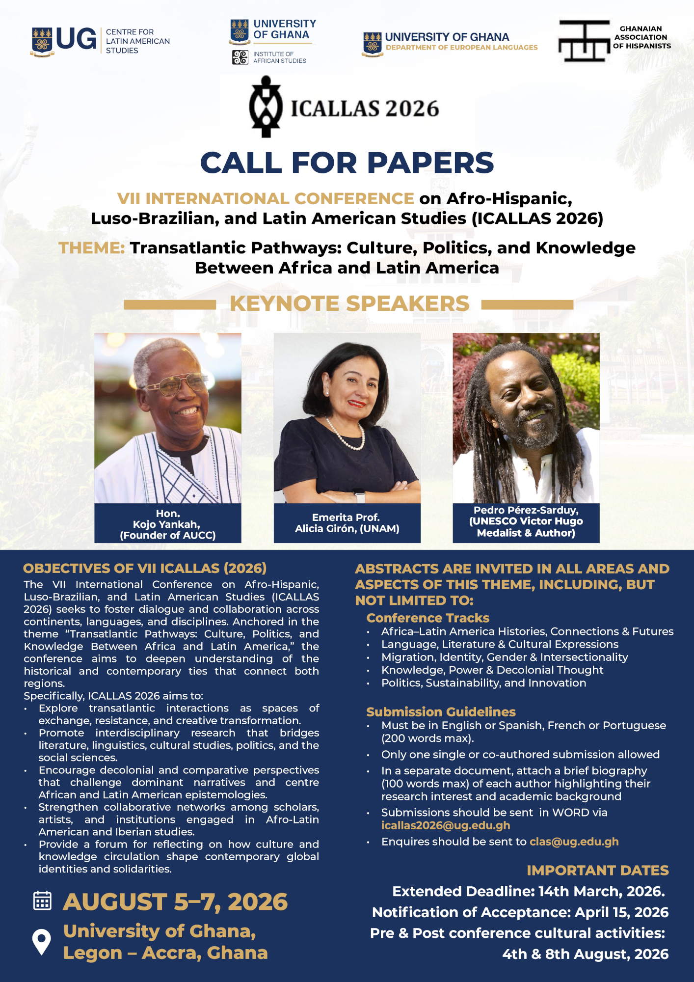 This is an interdisciplinary conference like no other. This year’s edition is organized by the Centre for Latin American Studies of the University of Ghana (UG) in collaboration with the Ghanaian Association of Hispanists, the Department of European Languages (UG) and the Institute of African Studies (UG). The purpose of ICALLAS is to build and sustain, on African soil, a dialogue among the various disciplines engaged in the study of issues related to Africa and the peoples of African ancestry in Brazil, the Caribbean, and the Spanish-speaking world. Participants are also encouraged to make presentations on the wider and inclusive geographic representation of French-speaking communities.